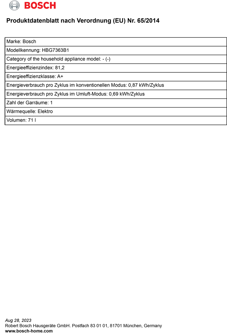 - Energieeffizienzklasse (gem. EU Nr. 65/2014): A+(auf einer