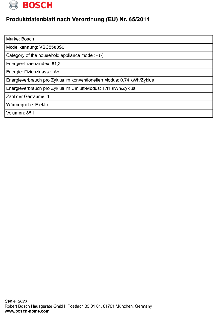 - Energieeffizienzklasse (gem. EU Nr. 65/2014): A+ (auf einer