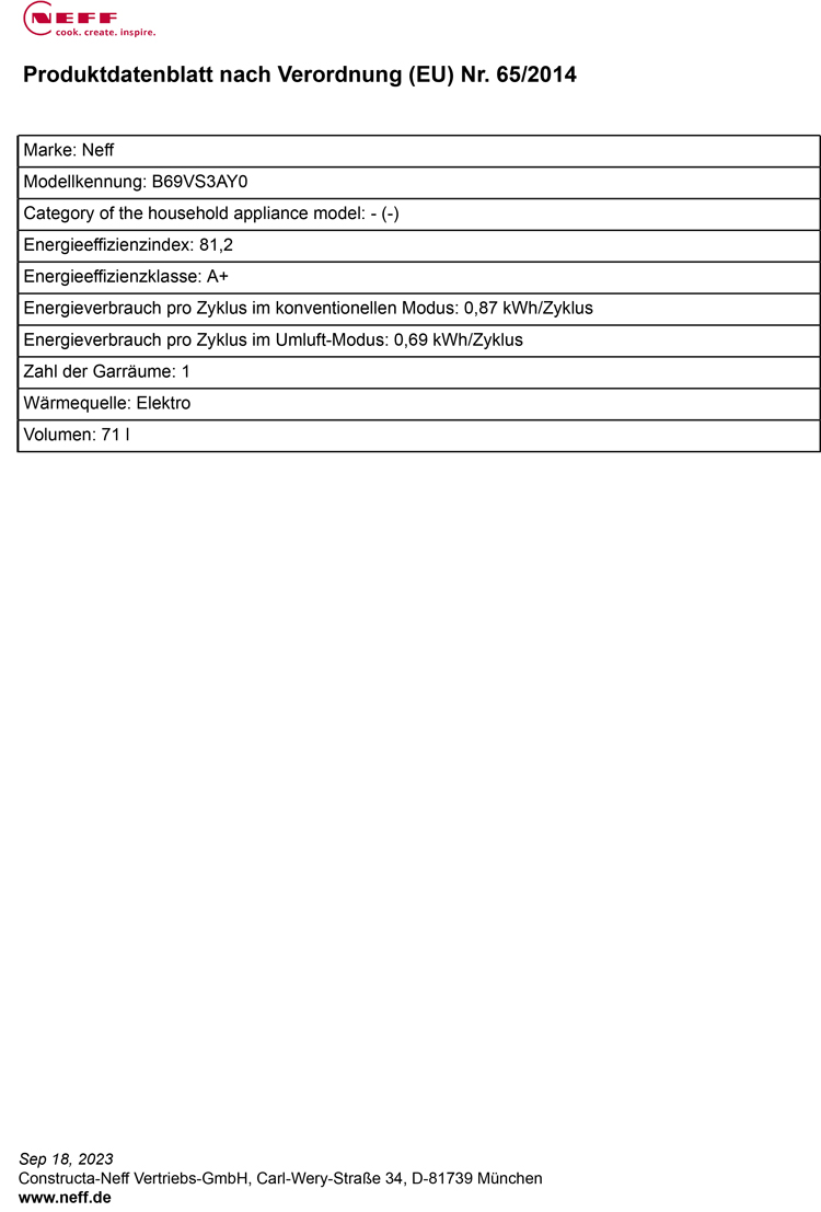 - Energieeffizienzklasse (gem. EU Nr. 65/2014): A+ (auf einer Energieeffizienzklassen-Skala von A+++ bis D)