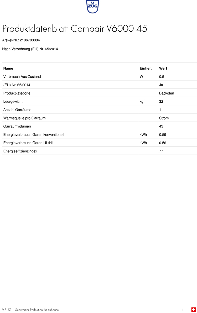 - Austausch gegen einen gleichwertigen oder neuen Artikel V-ZUG Combair V6000 45, Spiegelglas, WLAN, 2106700004 (ggf. auch ein Nachfolgemodell)
