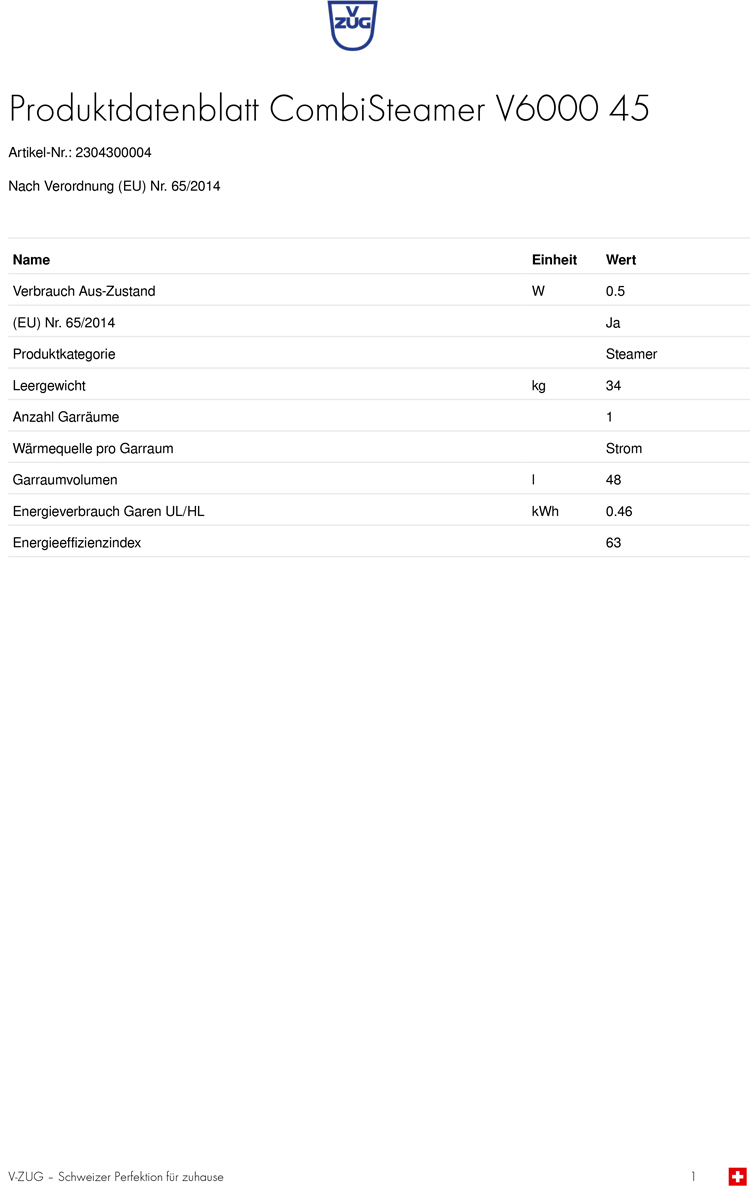 Artikelbezeichnung: V-ZUG Deutschland GmbH