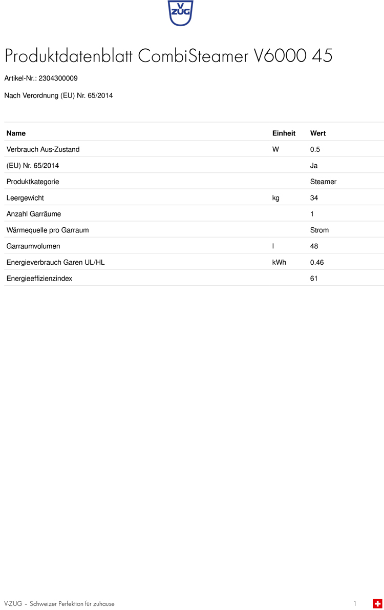 - Austausch gegen einen gleichwertigen oder neuen Artikel V-ZUG CombiSteamer V6000 45, Platinum, 2304300009 (ggf. auch ein Nachfolgemodell)