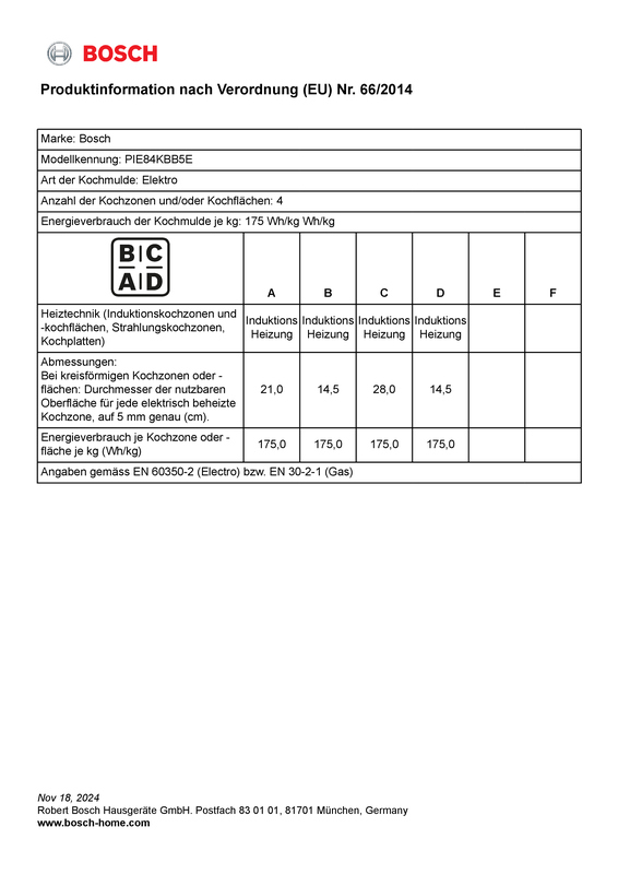 - Energieeffizienzklasse (gem. EU Nr. 65/2014): A+ (auf einer Energieeffizienzklassen-Skala von A+++ bis D)