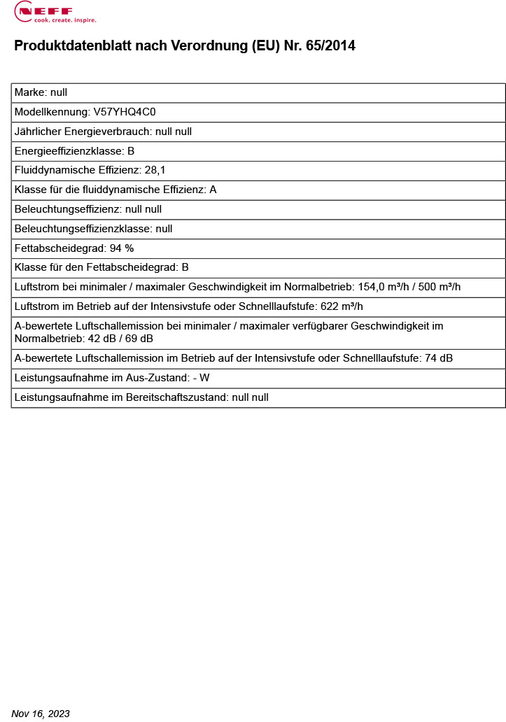 - Geräuschwerte bei Abluftbetrieb: min. Normalstufe 42 dB re 1 pW, max. Normalstufe 69 dB re 1 pW, max. Boost-/Intensivstufe 74 dB re 1 pW