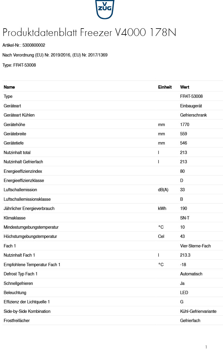 - Austausch gegen einen gleichwertigen oder neuen Artikel V-ZUG Freezer V4000 178N, Einbau Gefrier-Schrank, 5300800002, Linksanschlag (ggf. auch ein Nachfolgemodell)