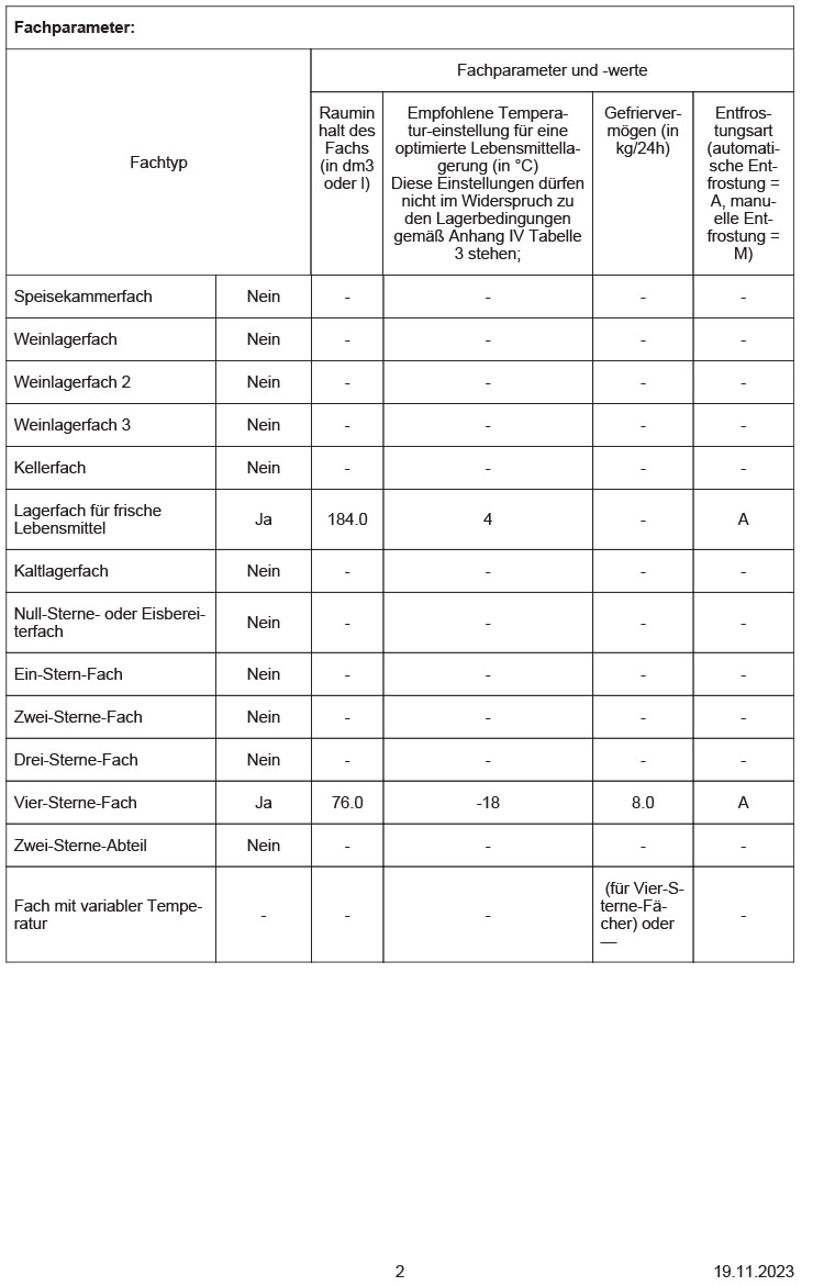 - Summe der Volumen der Kaltlagerfächer (EU 2017/1369): 184 l
