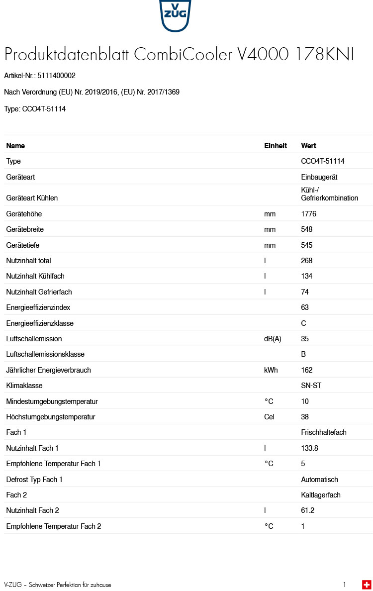 - Austausch gegen einen gleichwertigen oder neuen Artikel V-ZUG CombiCooler V4000 178KNI, Einbau-Kühlgefrier-Kombination (ggf. auch ein Nachfolgemodell)