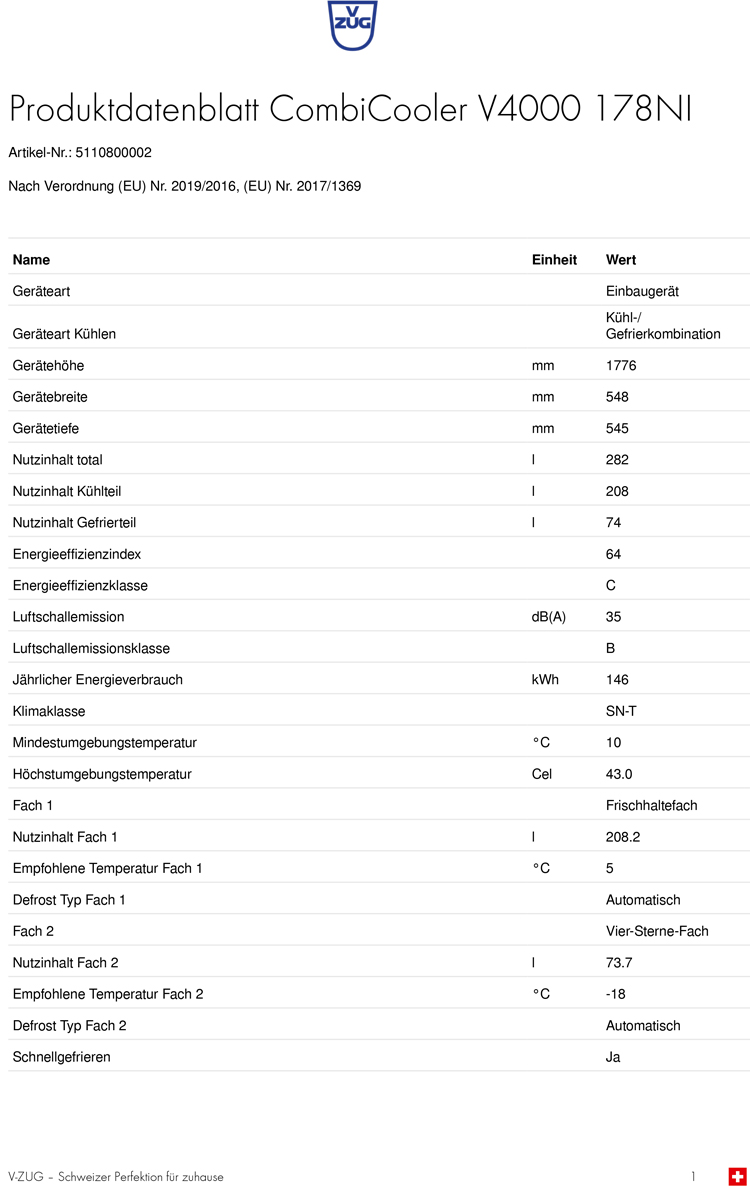 - Austausch gegen einen gleichwertigen oder neuen Artikel V-ZUG CombiCooler V4000 178NI, Einbau-Kühlgefrier-Kombination (ggf. auch ein Nachfolgemodell)