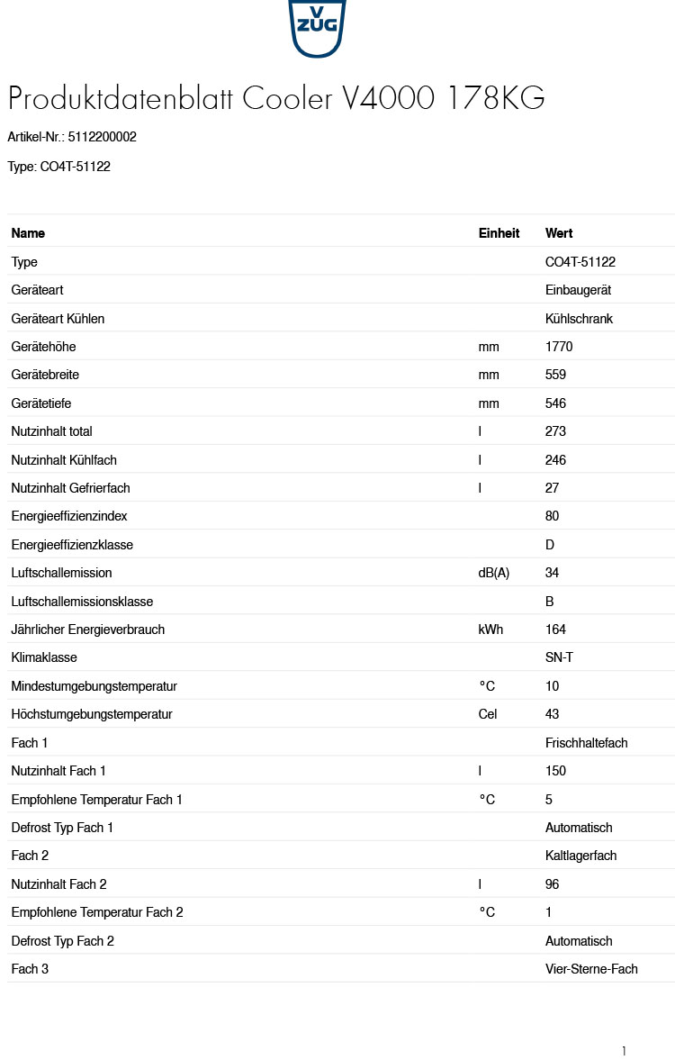 - Austausch gegen einen gleichwertigen oder neuen Artikel V-ZUG Cooler V4000 178KG, Einbau-Kühlgefrier-Kombination, 5112200002 (ggf. auch ein Nachfolgemodell)