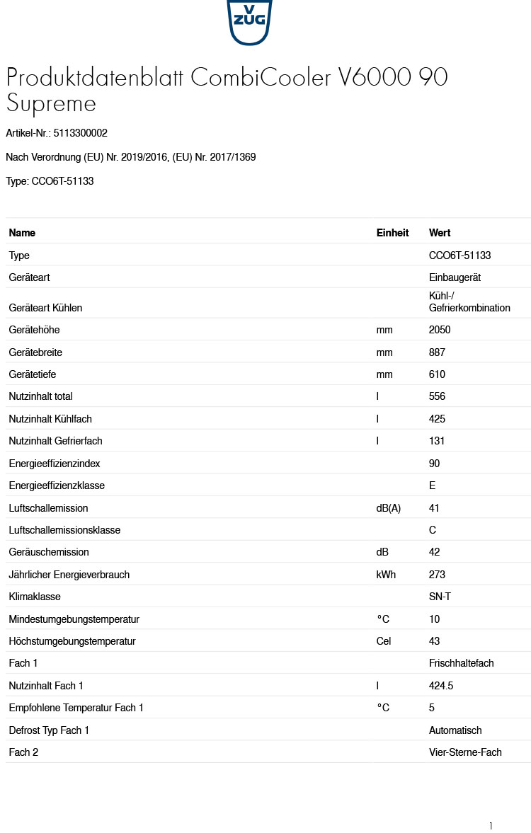 - Austausch gegen einen gleichwertigen oder neuen Artikel V-ZUG CombiCooler V6000 Supreme, 5109600012 (ggf. auch ein Nachfolgemodell)