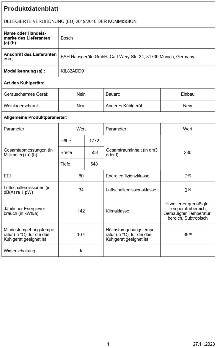 - Durchschnittlicher Energieverbrauch in Kilowattstunden pro Jahr (kWh/a): 142 kWh/annum