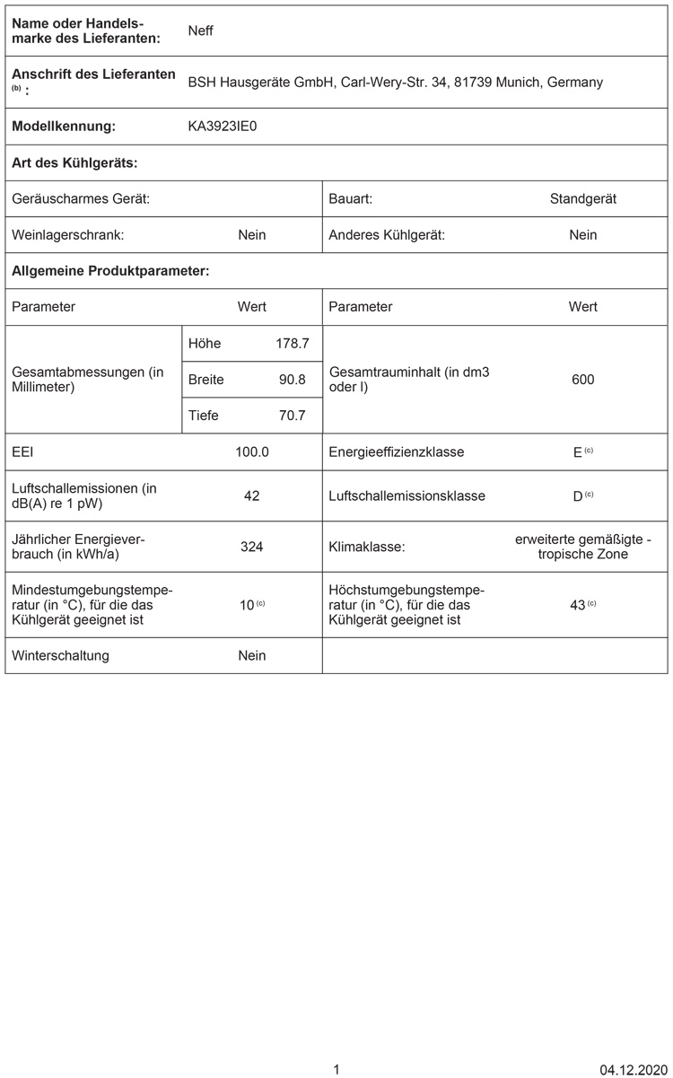 - Gerätemaße ( H x B x T): 180,8 cm x 90,3 cm x 68,2 cm