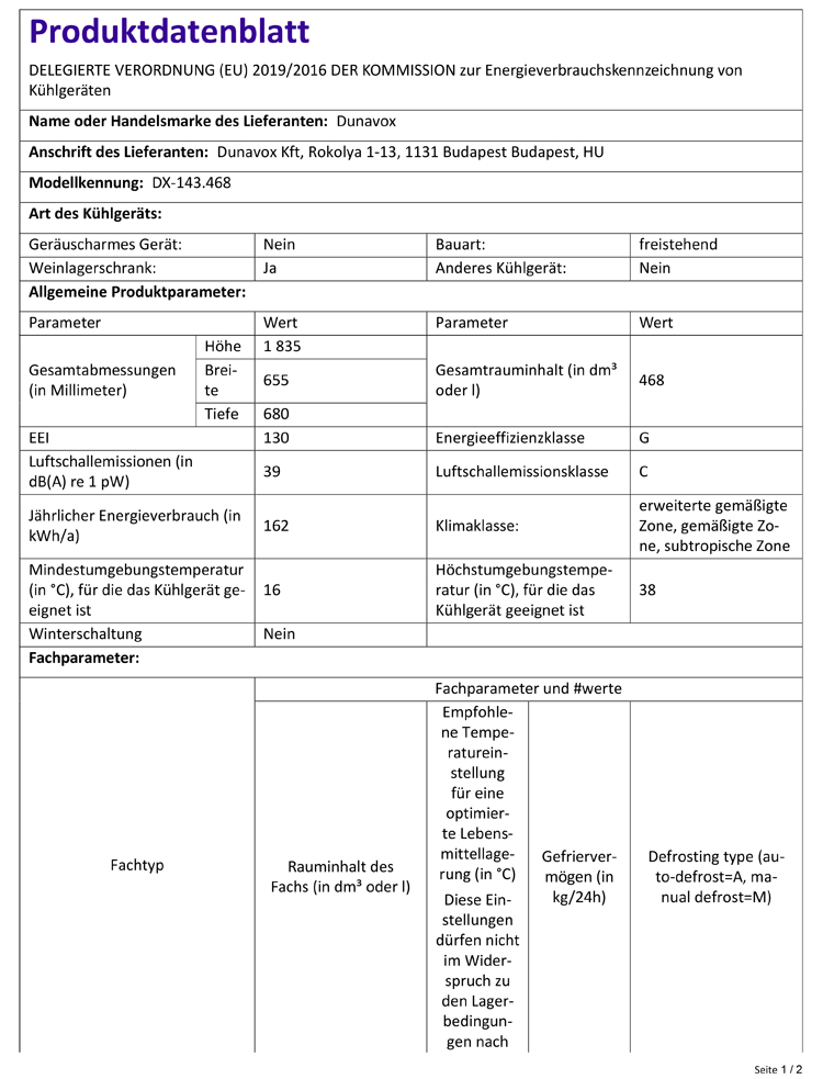- Jahresverbrauch gilt bei Voraussetzung einer Umgebungstemperatur von 25°C und einer Betriebstemperatur von ≥4°C.