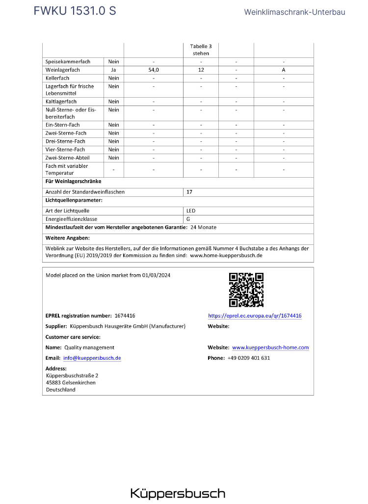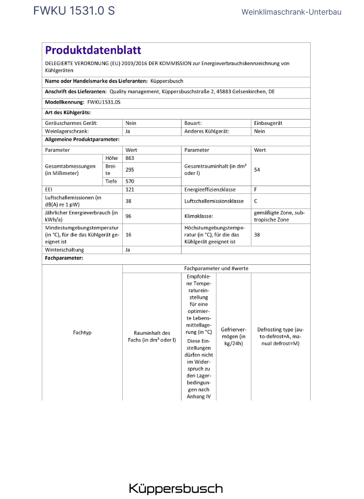 • Austausch gegen einen gleichwertigen oder neuen Artikel Küppersbusch FWKU 1531.0 (ggf. auch ein Nachfolgemodell).