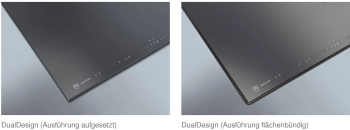 Einige Induktionskochfelder verfügen über ein neues und innovatives Gerätekonzept. Die aktuellen Ausführungen «Facettenschliff» und «flächenbündig werden durch das neue DualDesign abgelöst. Dank dieser neuen Designvariante kann dasselbe Kochfeld in Zukunft «flächenbündig» wie auch «aufgesetzt» eingebaut werden. Die aufgesetzte Version verfügt über eine Glaskante, welche für ein filigranes Erscheinungsbild sorgt und sehr robust ist. Die flächenbündige Version hingegen zeichnet sich dadurch aus, dass sie sich in jede Arbeitsplatte integrieren lässt und diese nicht unterbricht. Die Ausschnittmasse bleiben dabei unverändert.